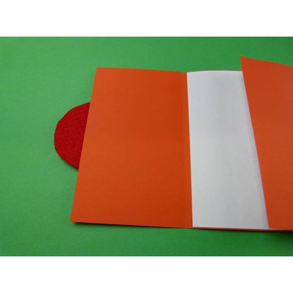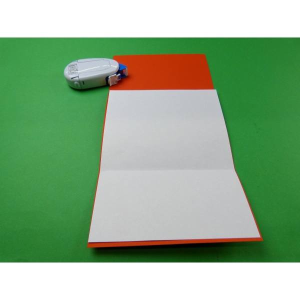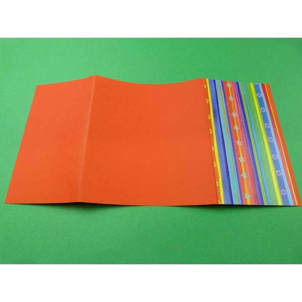 Zuerst fertigst du aus dem Tonkarton in orange oder Fotokarton eine Karte. Hierzu schneidest du den Tonkarton in eine Größe von 15x35 cm. Rechts und links faltest du ein Stück nach 10 cm. Auf die rechte Seite klebst du das bunte strukturierte Papier, je nach Gefallen.