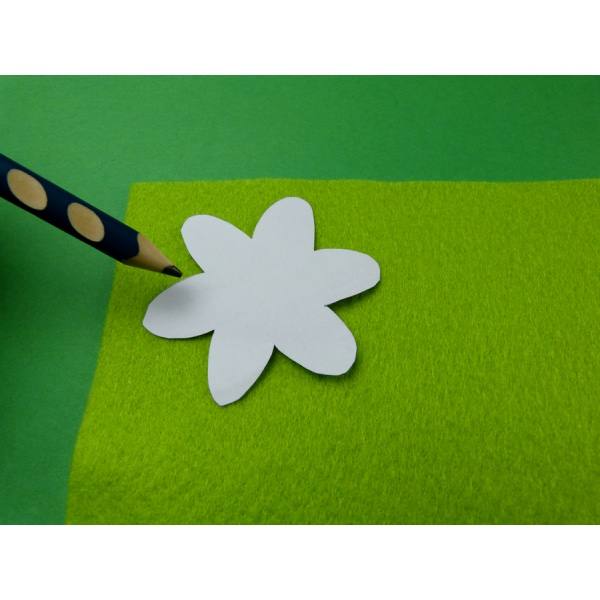 Dann fertigst du dir aus beiliegender Vorlage unterschiedlich große Blumenschablonen. Die große Blumenschablone zeichnest du auf grünem Bastelfilz auf und schneidest diese aus. Die kleine Blütefertigst du aus violettem Bastelfilz und den Kreis schneidest du aus rotem Filz. Der Kreis wird genau so groß wie die große Blüte.