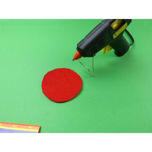 Jetzt klebst du mit der Heißklebepistole auf den Kreis die beiden Filzblumen und obenauf den kleinen farbigen Knopf.