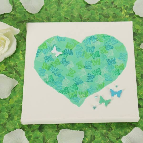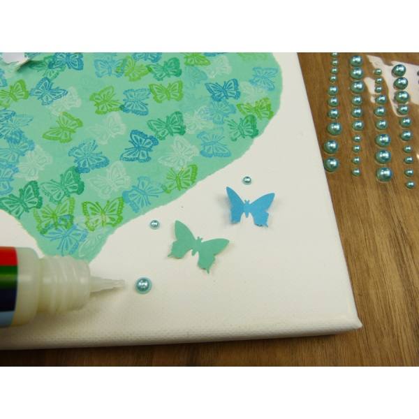 Das große Herz mit Kleber schön auf dem Keilrahmen platzieren und seitlich mit den ausgestanzten Schmetterlingen verzieren. Mit Schmucksteinkleber noch ein paar farblich passende Halbperlen aufkleben.